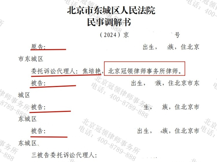 2024年,北京市东城区人民法院对孙女士与小孙等人排除妨害纠纷一案作出民事调解书。在冠领律师的帮助下,孙女士的合法权益得到有效维护,与小孙 【查看全文】