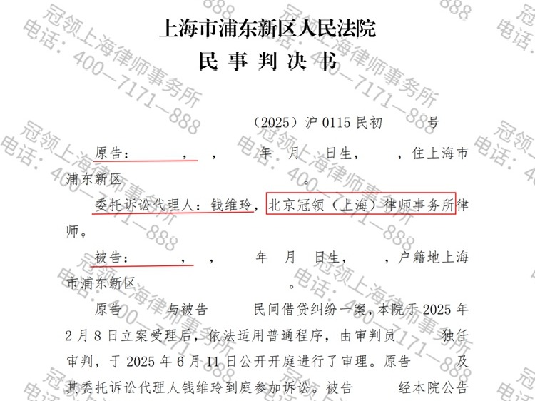 2025年,上海浦东的许女士因朋友孙先生迟迟未归还8万元借款,向北京冠领(上海)律师事务所求助。冠领律师代理她起诉后,法院经审理作出判决支持 【查看全文】