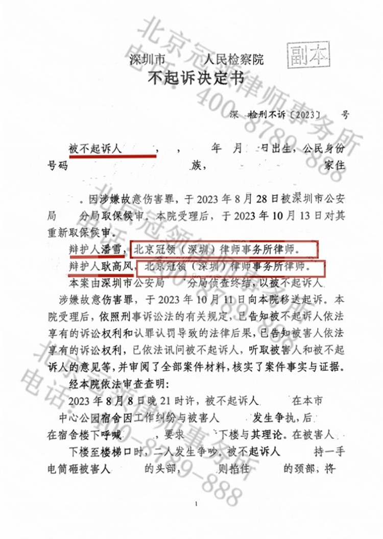 近期,冠领律师担任辩护人的深圳市某区一起故意伤害案,因当事人自首、认罪认罚且达成刑事和解,经过律师多次提交法律意见,与检察机关进行沟通,最终说服办案机关采纳“犯罪情节轻微无需刑罚”的辩护意见,成功争取到不起诉决定。