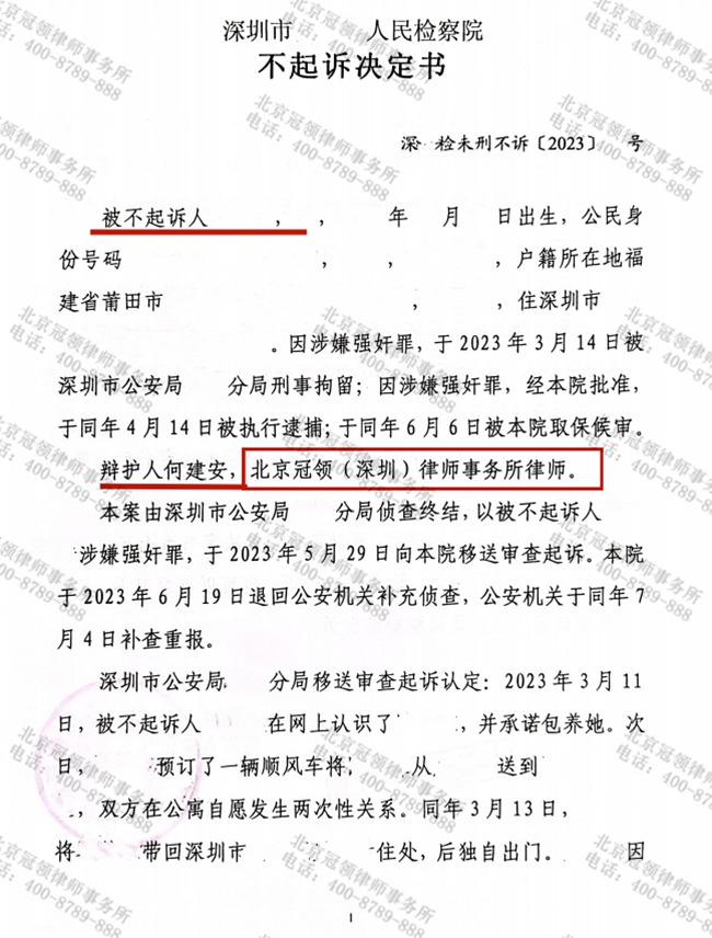 近期,冠领律师担任深圳市某区一起涉嫌强奸罪案件嫌疑人的辩护人,针对指控关键点“被害人年龄认定”及“性关系自愿性”展开精准辩护。律师多次与检察机关沟通,指出被害人骨龄鉴定与户籍年龄存在矛盾等问题,推动补充侦查。最终,检察机关采纳律师意见,以“事实不清、证据不足”作出不起诉决定。