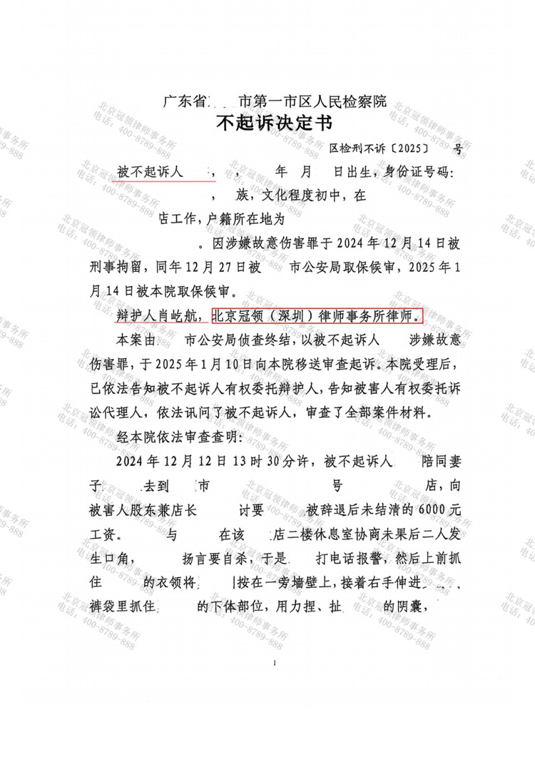 2024年12月12日,广东省东莞市某理发店内,孙某陪同妻子讨要欠薪时,因与店长陆某发生争执,冲突中致陆某轻伤二级。案发后,孙某被东莞警方采取刑事拘留措施,后被取保候审。案件移送检察机关审查起诉期间,冠领律师介入辩护,通过精准法律分析及有效沟通,最终推动东莞市第一市区检察院作出不起诉决定。
