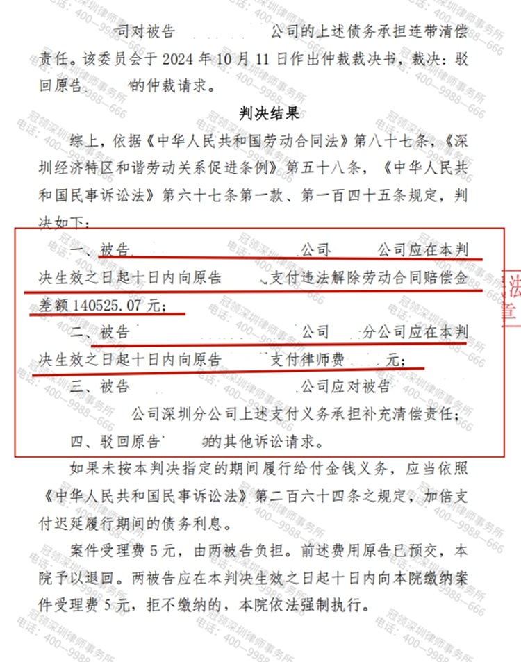2024年,深圳某公司员工陈女士遭遇了公司擅自调岗降薪,随后单方面解除劳动合同的对待。在自行申请劳动仲裁被驳回后,委托北京冠领(深圳)律师事务所代理维权。冠领律师立足证据,帮陈女士拿到14.5万元赔偿金。