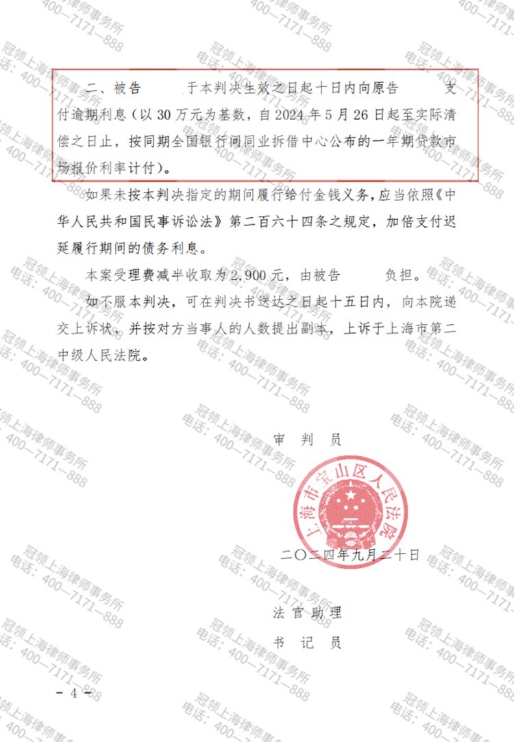 2020年秋天,上海宝山的柯女士怀揣对男友戴先生的信任,将30万养老钱借给戴先生的外甥尹先生应急。可借款到期后,尹先生却多番推脱,拒不还款,柯女士陷入绝望,遂来到北京冠领(上海)律师事务所求助。冠领律师受托介入,经细致梳理案情,庭上有力陈辩,法院在2023年5月作出判决,尹先生需限期归还柯女士30万元本金及逾期利息。
