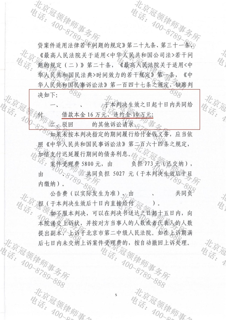 最终,法院采纳了冠领律师的代理意见,依法判决股东王某、李某限期支付秦先生借款本金16万及违约金10万。