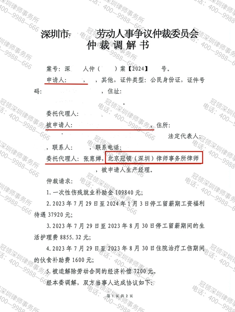 2024年8月,冠领(深圳)律所接受某建筑企业委托,代理一起劳动仲裁调解案。劳动者刘某主张一次性伤残就业补助金、停工留薪期工资等五项权益,索赔总额超16万元。冠领律师通过梳理证据链、辨析法律适用,成功与劳动者达成调解协议,为企业减少近60%赔偿金额,最终以6.8万元一次性了结争议。