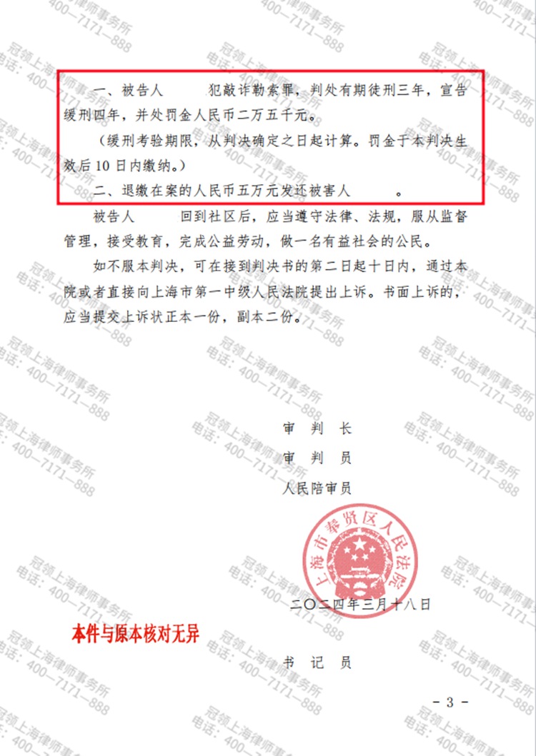 近期,冠领律师担任上海市奉贤区一起敲诈勒索案件被告人的辩护人。本案中,律师精准把握“犯罪未遂”及认罪认罚情节,通过多次提交法律意见、与检察机关深入沟通,成功说服法院采纳辩护观点。最终,法院对被告人宣告缓刑并适用从宽处罚。
