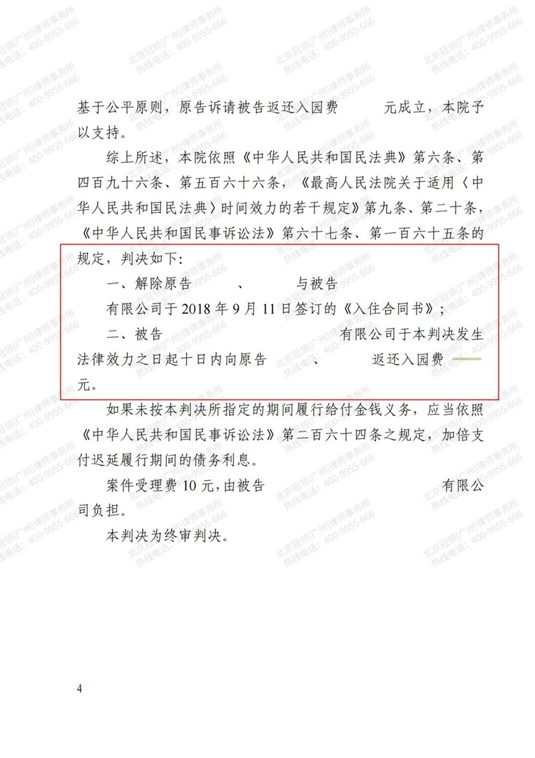 最终,审理法院采纳了冠领律师的代理意见,判决阳光养老院如数返还黄先生夫妇交付的全部入园费。