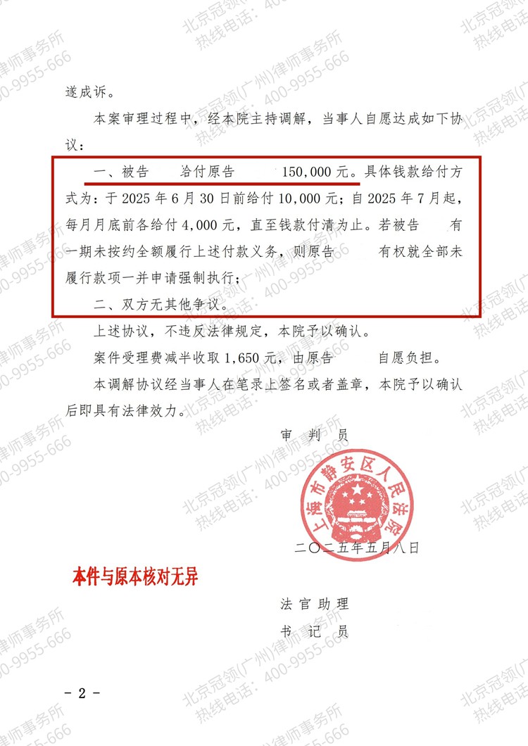 陈女士在恋爱时曾接受男友谢某代还信用卡。2024年分手后,谢某在上海静安起诉要求其归还约35万元。为应诉,陈女士委托冠领(广州)律所代理此案。冠领律师直击“赠与”主张漏洞,以无合意、用途为共同生活为据反驳,同步推动调解。通过精准举证与策略沟通,促成调解协议:陈女士分期返还15万元。