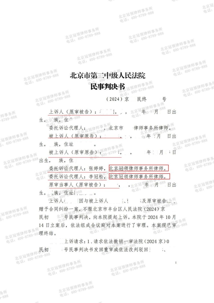 近日,北京市第二中级人民法院审结了一起赠与合同纠纷案。在北京冠领律师的代理下,案件被上诉人王先生夫妇再次胜诉,成功保住房产。