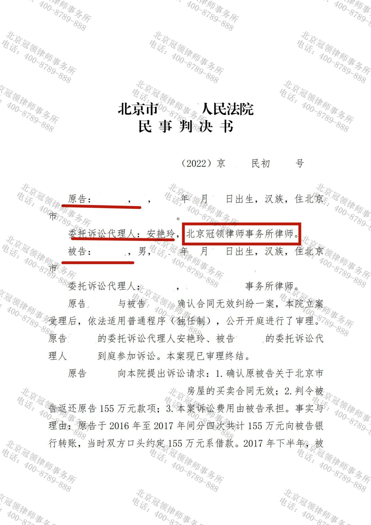 155万元的出借款项变成购房款,而所购房屋又因违建被强拆。钱房两失的林闻山(文中除律师外皆为化名)想要回这155万元,对方却坚持钱已经交付给开发商,自己与此事无关。无奈之下,他将此事委托给北京冠领律师事务所的安艳玲律师,结果如愿以偿,安律师成功地维护了委托人的合法权益。