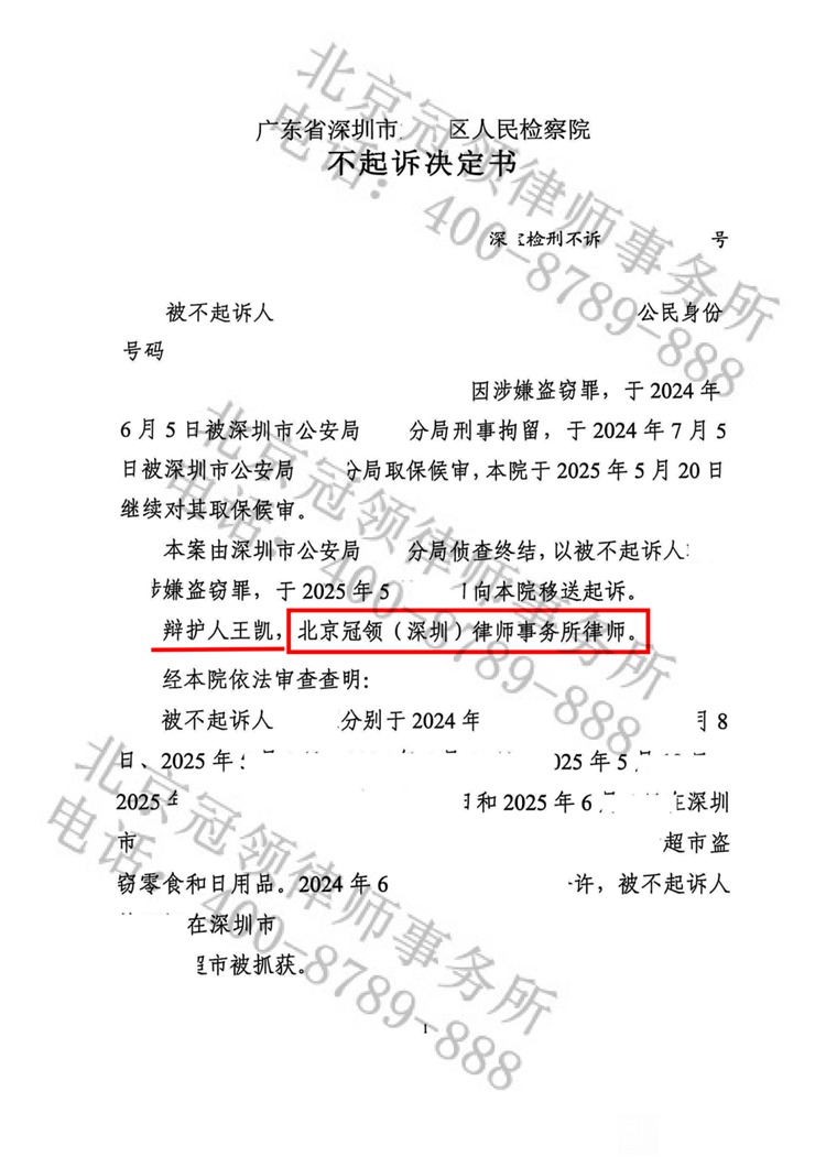 2024年5月至2025年6月间,男子何某因在深圳市某区一家超市内八次拿取零食、日用品未付款,被指控涉嫌盗窃罪,历经刑事拘留、取保候审等程序,案件移送深圳市某区检察院审查起诉。在冠领律师的专业辩护下,案件最终取得不起诉结果。
