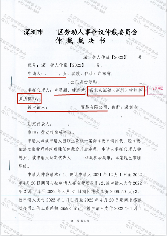 2022年10月25日,北京冠领(深圳)律师事务所律师代理的一起劳动争议案,经当地仲裁机构审理,获得胜诉。冠领律师立足证据与法律条款,成功帮助当事人拿回劳动报酬三万余元。